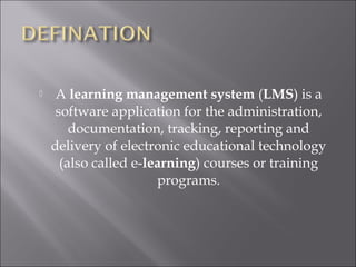 The document discusses the functionalities and benefits of a Learning Management System (LMS), which aids in the administration and tracking of e-learning courses, while emphasizing its role in managing competency, structuring curricula, and delivering training programs. It highlights that while LMS platforms enhance educational delivery across organizations like schools and businesses, they primarily serve as activity tracking tools rather than decision-making instruments. The document also mentions esolpk's LMS as a customizable solution, preferred by several large companies, providing significant cost savings and advanced features tailored for enterprise needs.