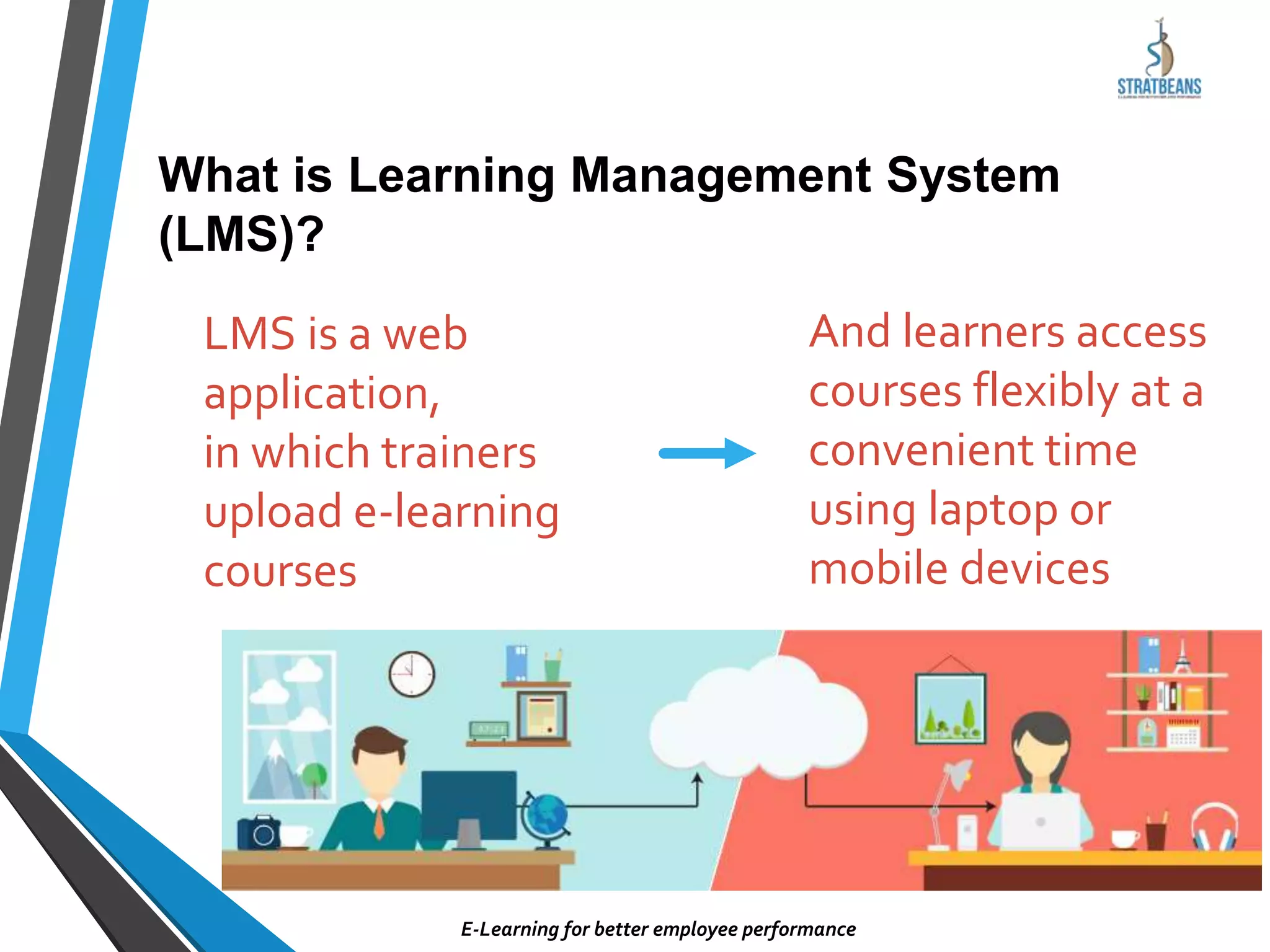 A Learning Management System (LMS) is a web application that allows trainers to upload e-learning courses for learners to access conveniently. It aims to improve training experiences, reduce costs, and enhance employee performance by providing tools for better knowledge dissemination and reduced clerical tasks. For more information, interested parties can contact Stratbeans Consulting for a free demo and consultation.