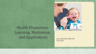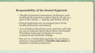 This document provides information on health promotion and education for dental hygienists. It discusses the responsibility of dental hygienists to educate patients on oral health. It also covers principles of learning, motivation, and behavior change theories like the health belief model and transtheoretical model. Examples of effective teaching tools and therapeutic communication techniques are presented. Throughout the document, there is an emphasis on meeting patients where they are at and facilitating behavior change through education and empowerment.