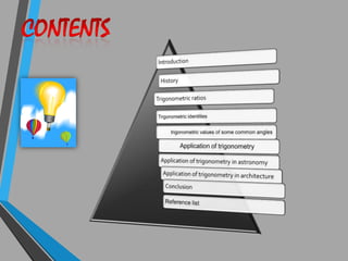 Trigonometry is a branch of mathematics that deals with relationships between the sides and angles of triangles, especially right triangles. It has many applications in fields like astronomy, navigation, engineering, and more. Some key uses of trigonometry include measuring inaccessible heights and distances by using trigonometric functions and properties of triangles formed by angles of elevation or depression. For example, trigonometry can be used to calculate the height of a building or tree by measuring the angle of elevation from a known distance away. It also has applications in measuring distances in astronomy, designing curved architectural structures, and calculating road grades. The document provides examples of various real-world applications of trigonometric concepts.