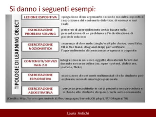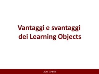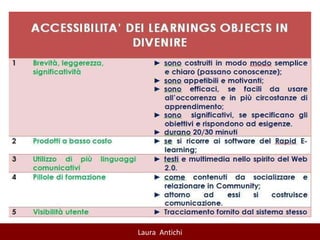 Il documento discute l'importanza e l'applicazione dei learning objects (LO) nell'e-learning, evidenziando la loro modularità e riutilizzabilità in contesti educativi diversi. Sottolinea la necessità di standardizzare la progettazione dei LO e la loro integrazione nei sistemi di gestione dell'apprendimento per migliorare l'efficacia e la personalizzazione dell'apprendimento. Inoltre, si affrontano i potenziali svantaggi dell'uso eccessivo di LO e si propone un approccio costruttivista all'istruzione.