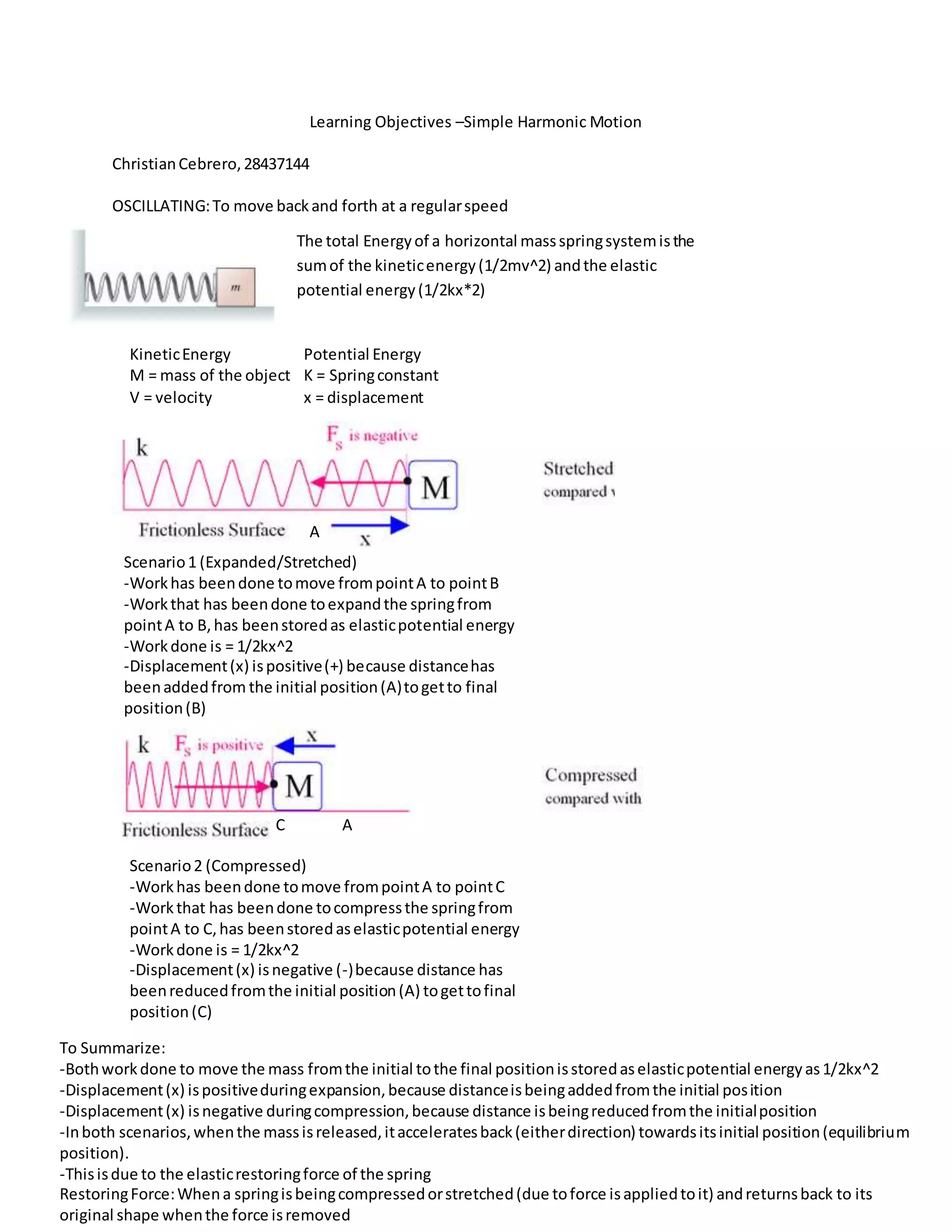 The document discusses the energy of a horizontal mass-spring system. It is the sum of the kinetic energy (1/2mv^2) and the elastic potential energy (1/2kx^2). It provides two scenarios: (1) when the spring is expanded, the displacement is positive, and (2) when the spring is compressed, the displacement is negative. In both scenarios, when the mass is released, it accelerates back towards its initial position due to the elastic restoring force of the spring.