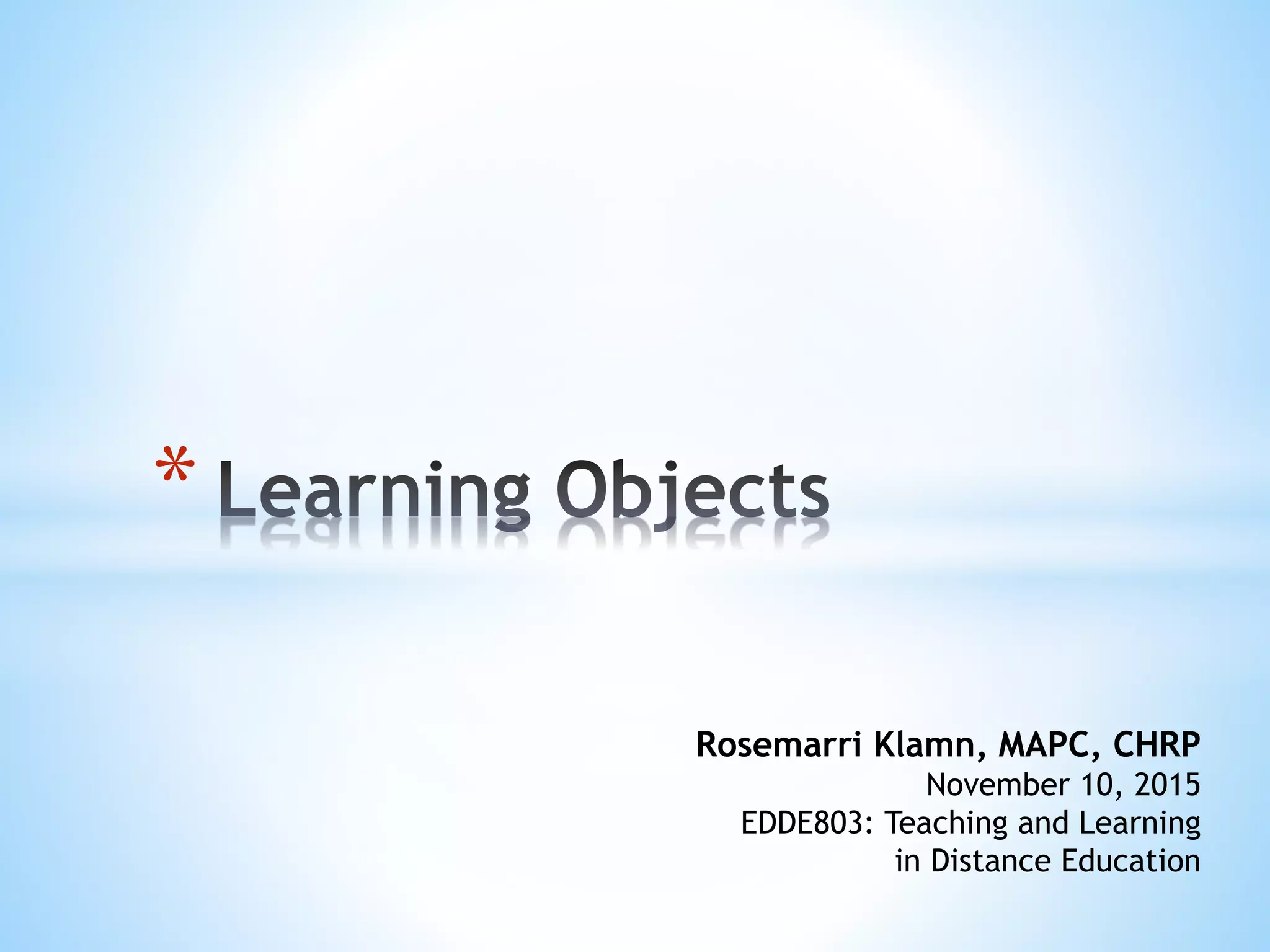 The document provides an overview of learning objects, covering their definitions, effectiveness, and usage in distance education along with various theories and barriers associated with their development. It emphasizes the importance of factors such as granularity, specificity, and accessibility in creating effective learning objects and includes references to various studies and guidelines. The text also discusses the role of technology in enhancing learning experiences and the necessity of training for educators in using these digital resources.