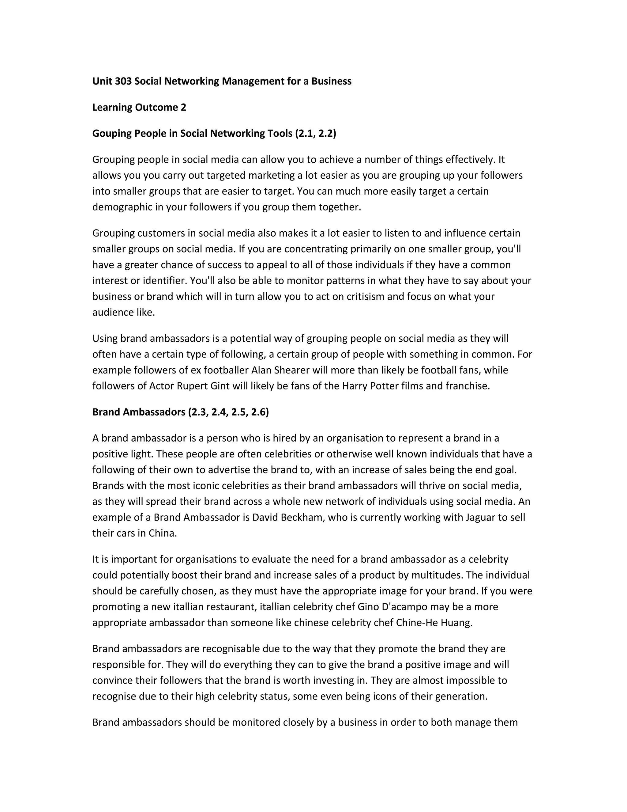 Grouping customers on social media makes targeted marketing and listening to feedback easier. It allows businesses to focus on smaller groups with common interests. Brand ambassadors are paid to represent brands in a positive light and spread the brand through their own social networks. Influencers are individuals with large social media followings who may choose to promote brands but are not officially tied to any company. They are harder to manage than brand ambassadors since they can voice any opinion. The key difference is that brand ambassadors are paid to maintain a brand's image while influencers have more independence in what they say.