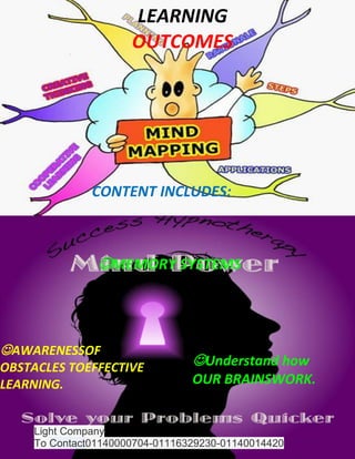 This document discusses learning outcomes and covers memory systems, understanding how our brains work, and awareness of obstacles to effective learning. It provides information on content related to memory, cognition, and challenges that can impact the learning process.