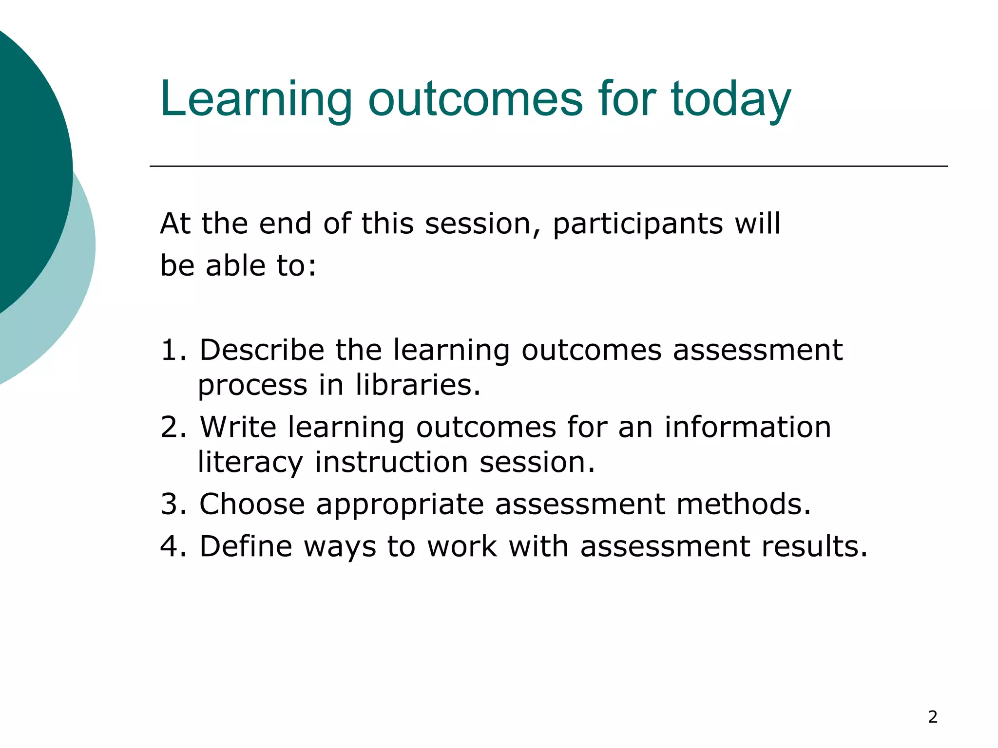 The document discusses the importance of learning outcomes assessment in libraries, outlining processes for developing and assessing instructional activities. It emphasizes the need for clear, measurable outcomes that focus on what students should achieve, and provides guidelines for creating effective learning outcomes. Additionally, it offers various assessment methods and highlights the role of assessment in improving instructional efficacy and library contributions to student learning.