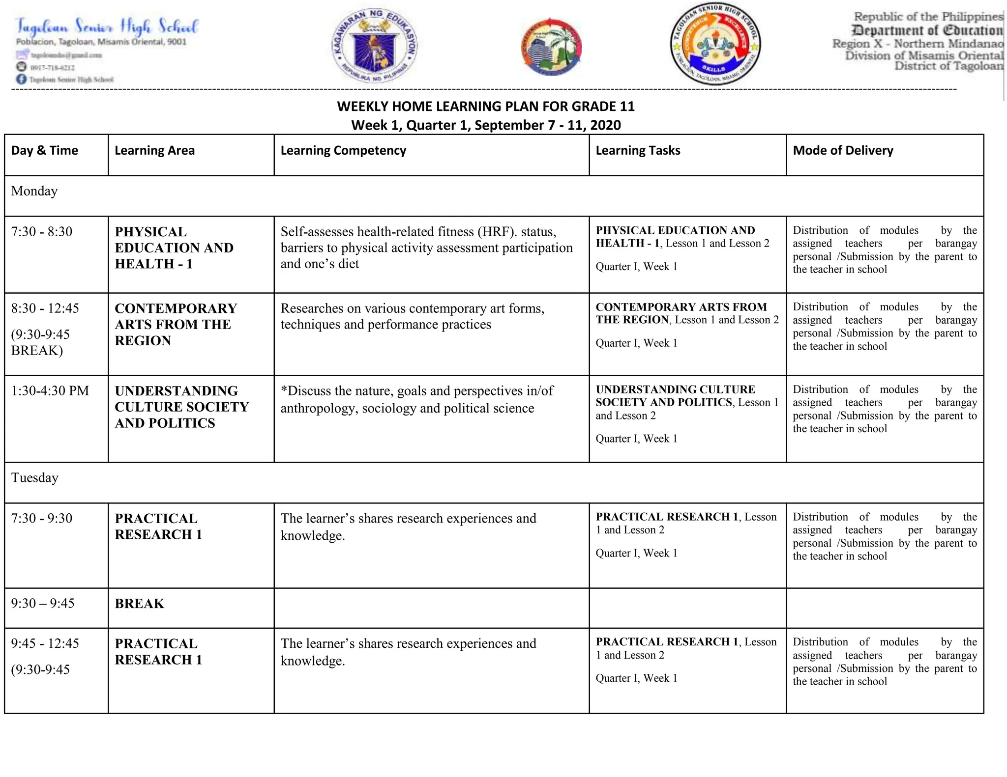 The document is a weekly home learning plan for Grade 11 for the week of September 7-11, 2020, outlining daily subjects, competencies, learning tasks, and modes of delivery. It includes a detailed schedule for subjects such as Physical Education, Contemporary Arts, Practical Research, General Mathematics, and others, with instructions for module distribution and submission. Parents are advised to drop off completed modules at designated drop-boxes in schools by the scheduled submission dates.