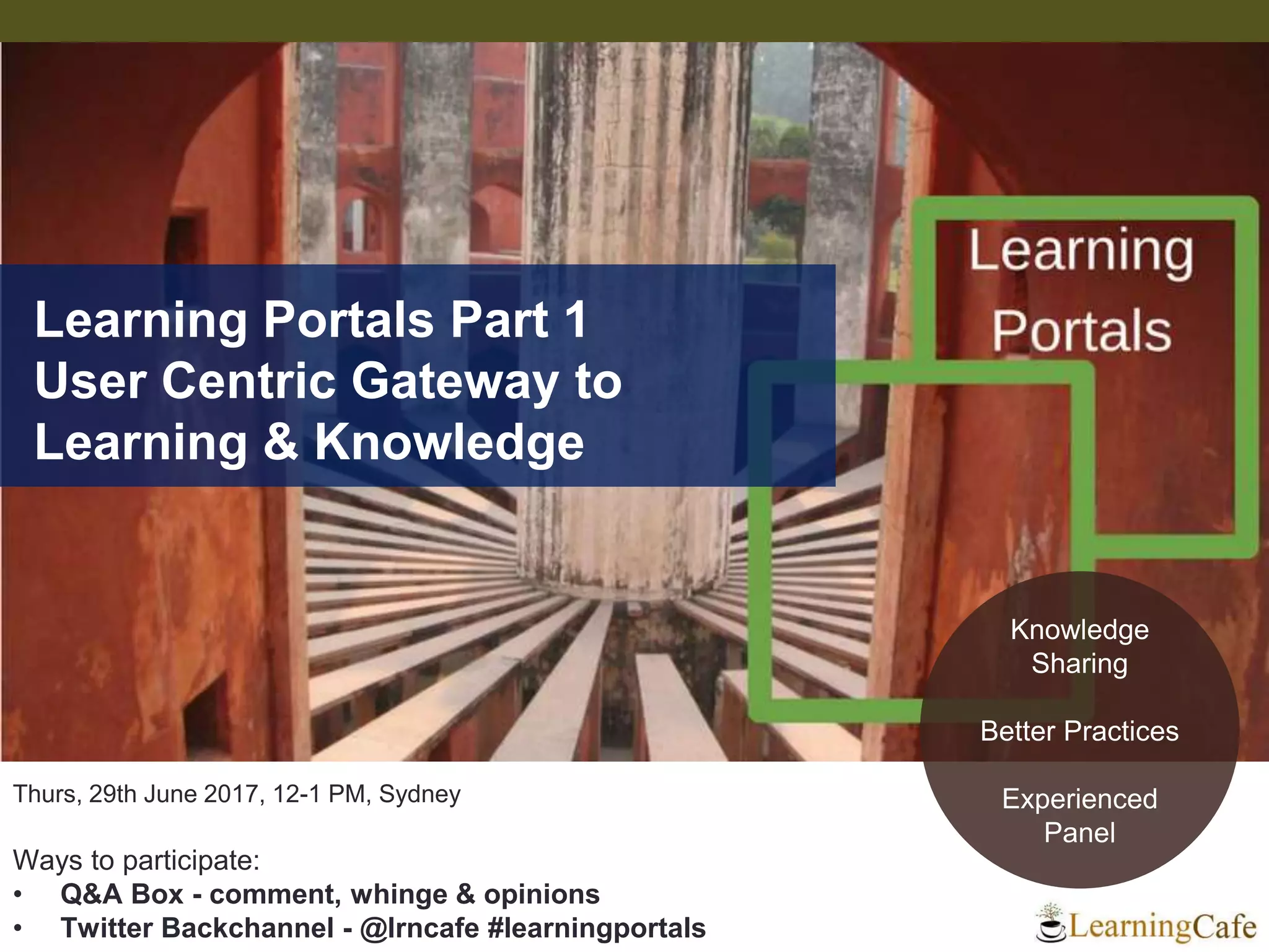 The document discusses a webinar on learning portals held on June 29, 2017, focusing on user-centric approaches to knowledge sharing and access within organizations. It emphasizes the importance of developing effective learning portals that cater to both learners and organizational goals, highlighting challenges such as low engagement and the need for discretionary learning. Participants are encouraged to explore design thinking principles and technology integration to create a more valuable and efficient learning experience.