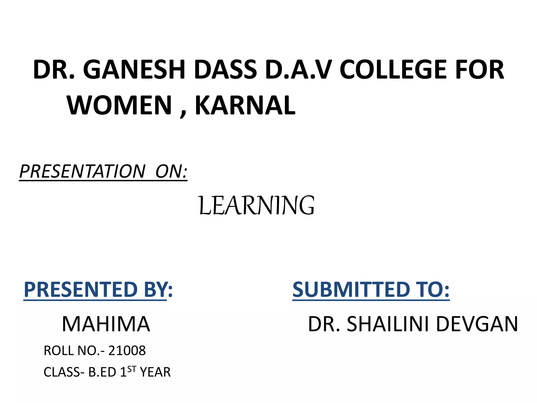 This document defines learning and discusses its nature and types. It defines learning as a relatively permanent change in behavior resulting from experience. The nature of learning includes that it is universal, occurs through experience, is continuous from birth to death, results in behavioral changes, and is a process of adjustment. The types of learning discussed are motor learning, verbal learning, concept learning, discrimination learning, learning of principles, problem solving, and attitude learning.