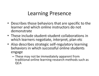 This document summarizes research on learning presence in online education. It finds that online learners who are more strategic, active, and reflective tend to have better outcomes. Specifically, features like self-reflection prompts improve online learning. However, current models of self-regulated learning are tied to older views of knowledge as memorization and don't capture regulation online. The document advocates revising theories to focus on how learners organize materials, structure their environment, seek help, and reflect on performance. It also reports initial findings that online learners struggle with time management, help seeking, and interacting with peers, suggesting where instructional design could help foster self-efficacy and learning presence.