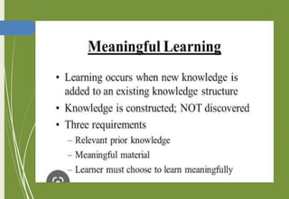 The document introduces key concepts in psychology related to learning, defining it as a process that leads to change through experiences. It discusses various factors influencing learning such as intelligence, motivation, and maturation, and outlines Thorndike's trial and error learning theory, which emphasizes problem-solving through experimentation. Additionally, it presents Thorndike's three laws of learning: readiness, effect, and exercise.