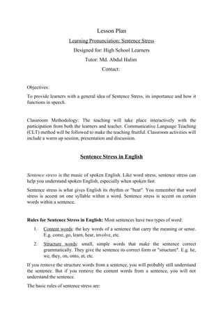 The document outlines a lesson plan aimed at high school learners to teach them about sentence stress in English, highlighting its significance and functionality in speech. It describes the interactive teaching methodology, where content words are stressed while structure words are unstressed, and provides examples and exceptions to these rules. Ultimately, mastering sentence stress is presented as essential for improving spoken English and achieving a more native-like rhythm in speech.