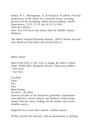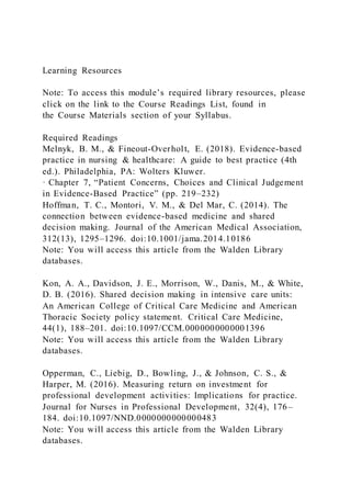 The document provides learning resources for a course module, including required readings from textbooks and peer-reviewed journal articles that can be accessed through the university library databases. Students are instructed to read a chapter on patient concerns, choices and clinical judgment in evidence-based practice, as well as several journal articles on topics like shared decision-making, return on investment for professional development, and using decision aids to facilitate patient choices. One article is from a website providing information on patient decision aids.