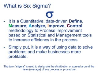 The document outlines the principles and practices of Six Sigma, a data-driven methodology aimed at process improvement and efficiency in organizations. It emphasizes the roles of various team members, including champions, black belts, and green belts, in driving quality and reducing defects while focusing on customer satisfaction. Additionally, the document discusses the systematic approach of the DMAIC framework and tools like FMEA and control charts to identify and control process variations.
