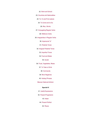 This document outlines vocabulary and grammar concepts for learning Spanish across three levels (Spanish I, II, and III). It covers basic greetings and phrases, pronunciation, the alphabet, articles, subject pronouns, verbs like ser and estar, question words, numbers, days/months/seasons, directions, colors, and time expressions. Grammar topics presented include plural nouns, possessive adjectives, reflexive verbs, verb conjugations, preterite and imperfect tenses, commands, and the subjunctive mood. Cultural notes are also provided on greetings, names, and asking questions. The document serves as a comprehensive reference for learning essential Spanish language topics.