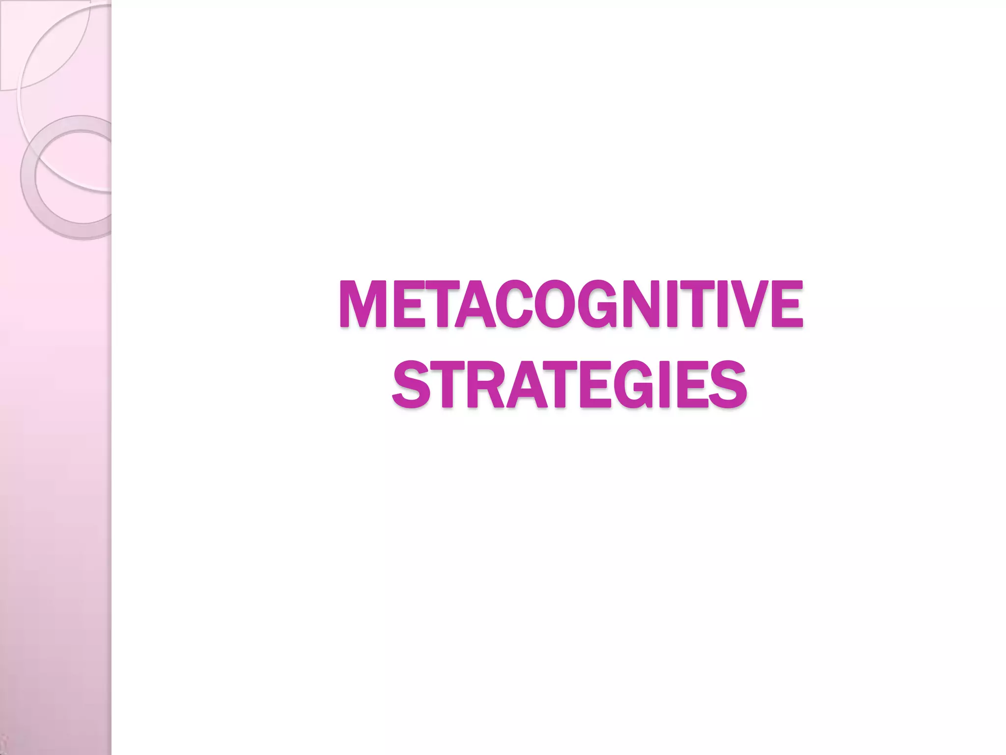 The document discusses various cognitive and metacognitive learning strategies that teachers can use to help students, particularly those with learning disabilities. It describes metacognitive strategies as methods that help students understand how they learn by thinking about their own thinking. Specific metacognitive strategies discussed include planning/organizing, identifying problems, evaluating work, managing one's own learning, and thinking aloud. Cognitive strategies are mental processes used to accomplish cognitive goals, such as outlining for essay writing. The document provides examples of task-based cognitive strategies involving using background knowledge, inferences, predictions, personalization, cognates, paraphrasing, images, sounds, kinesthetic senses, patterns, classification, note-taking, graphic organizers, summarization,