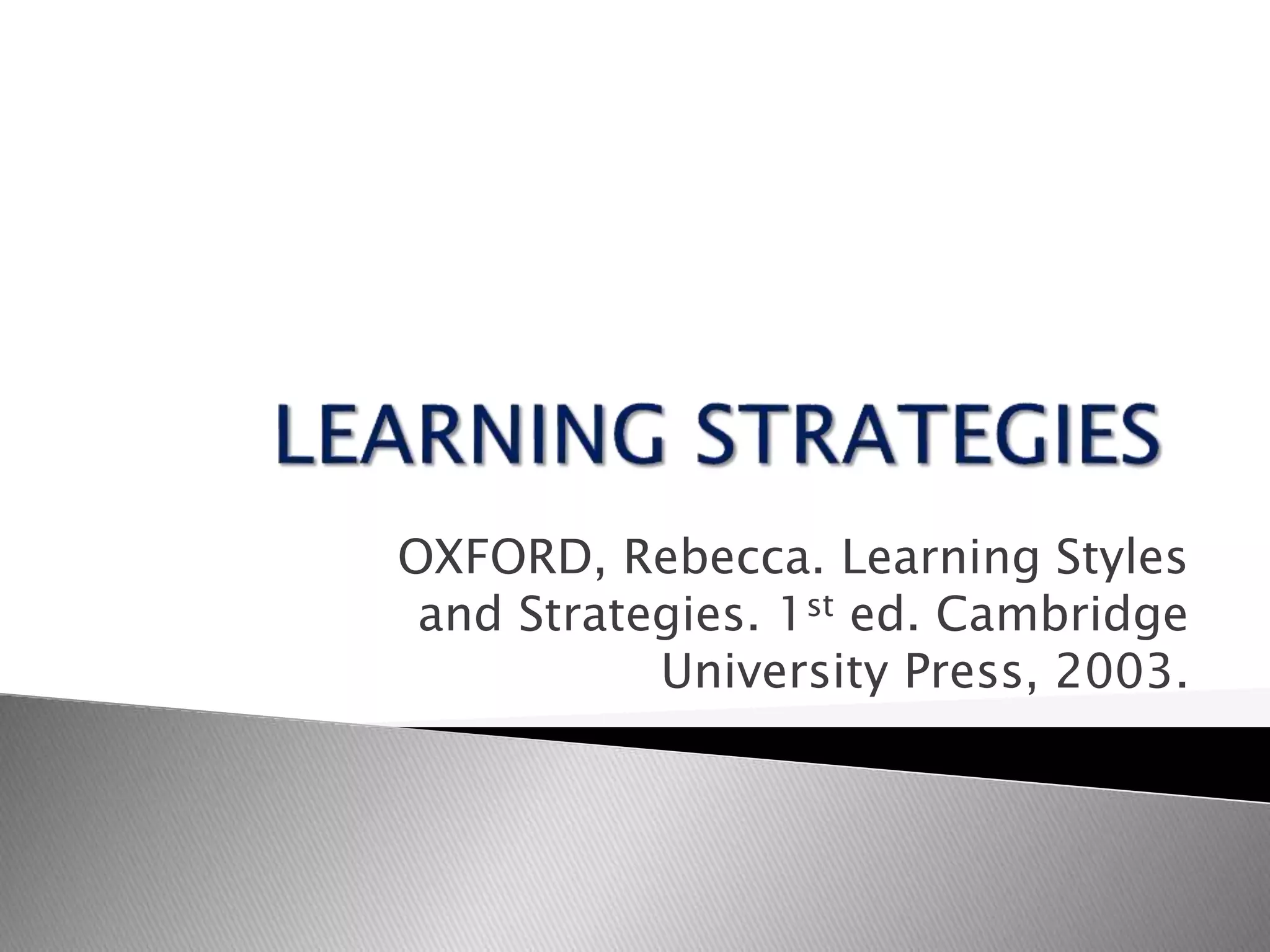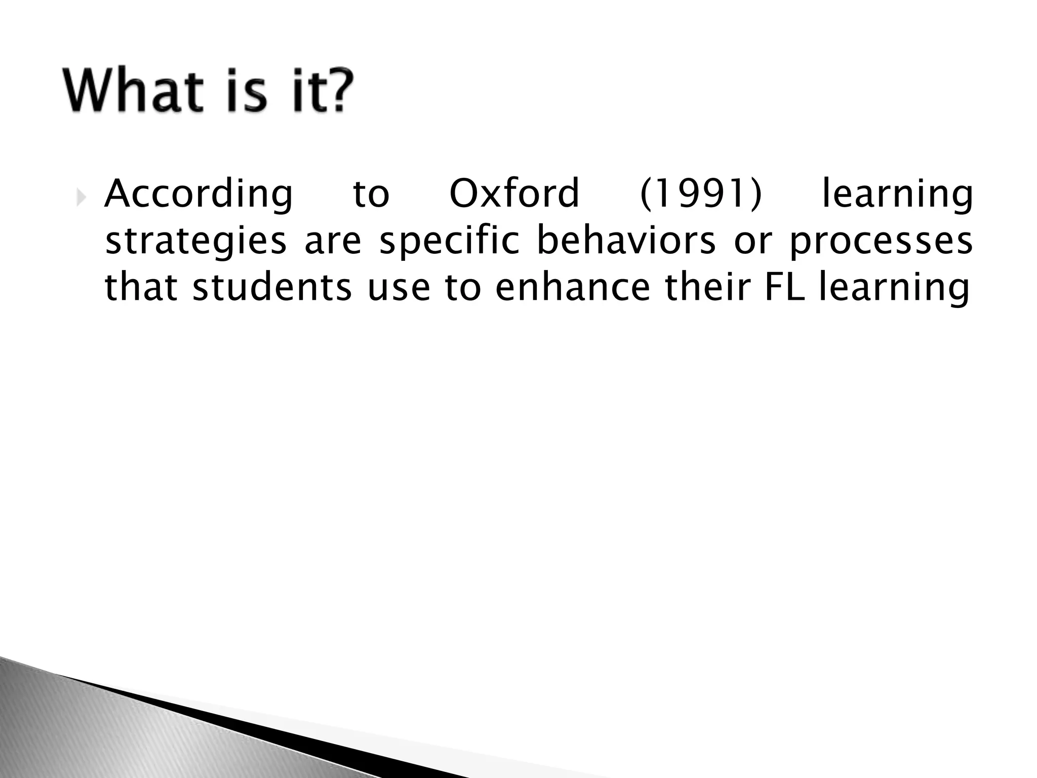 The document discusses learning strategies and their importance for language learning. It defines learning strategies as specific behaviors or processes used by students to enhance their language learning. Effective strategies are tailored to students' individual learning styles and the language task. The document outlines different types of strategies, including cognitive, metacognitive, memory-related, compensatory, affective, and social strategies. It emphasizes that teachers should instruct students on selecting and applying relevant strategies to make learning easier, more enjoyable, and transferable to new situations. When students learn to use strategies that match their learning preferences, they can become more autonomous, self-aware learners who achieve higher proficiency levels.