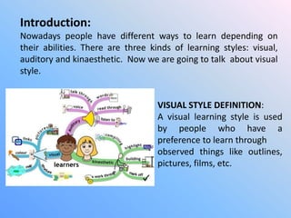 Visual learners prefer to learn through visual means like pictures, diagrams, and demonstrations rather than listening. They recognize and remember visual information faster than other types of information. Characteristics of visual learners include preferring reading over listening, having good handwriting, enjoying activities like watching films and doodling, and using visualization to help concentrate on reading. Visual learners tend to do well in professions involving visual tasks like writing, drawing, and design work.