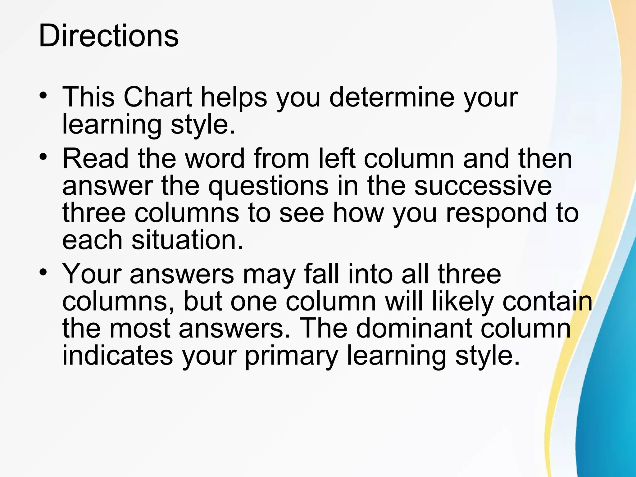 This document presents a learning styles chart to help determine if a person has a visual, auditory, or kinesthetic learning style. It lists common situations and asks the reader to identify if they are more likely to respond visually, auditorily, or kinesthetically. Their dominant response column indicates their primary learning style. The chart contains questions about spelling, talking, concentrating, meeting people, business contacts, reading, learning new tasks, putting things together, and getting computer help. It is designed to help readers understand which sensory mode they most rely on for taking in and processing information.