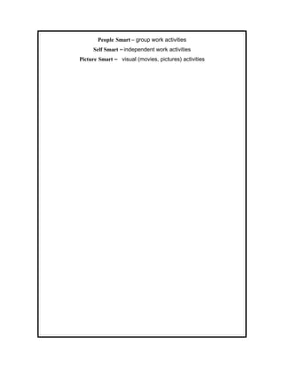 There are many theories about learning styles and intelligences. Howard Gardner's Theory of Multiple Intelligences suggests that people have different types of intelligences such as musical, bodily, nature, logical, linguistic, interpersonal, intrapersonal, and visual intelligences. Teachers can use knowledge of students' intelligences to plan lessons incorporating engaging activities like listening, roleplaying, experiments, analysis, reading, group work, independent work, and visual activities.