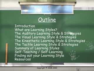 The document discusses different learning styles: auditory, visual, kinesthetic, and tactile. Auditory learners benefit from listening, while visual learners prefer visual information like reading. Kinesthetic learners like hands-on activities and tactile learners enjoy using their senses. Knowing your own learning style can help you study more effectively using appropriate strategies. The document also provides a learning styles quiz and resources for further information.
