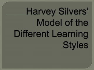 This document discusses learning styles and multiple intelligence theories. It describes four main learning styles: mastery, interpersonal, understanding, and self-expressive. Each style has preferences for how information is learned and judged. The document also outlines eight intelligences - linguistic, logical-mathematical, spatial, bodily-kinesthetic, musical, interpersonal, intrapersonal, and naturalist - and provides examples of careers that suit each intelligence type within the four learning styles.