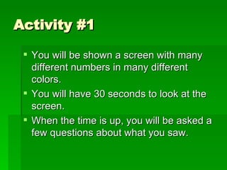 The document describes two activities to assess learning styles. The first activity involves students answering questions about numbers on a screen to determine if they are visual learners. The second activity involves dividing students into groups with different tasks like holding objects to see how they perform on name recall questions. It then provides information about visual, auditory, and kinesthetic learning styles including their key characteristics and retention rates with different study methods.