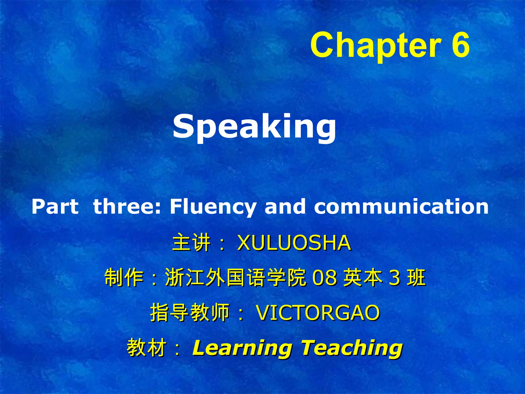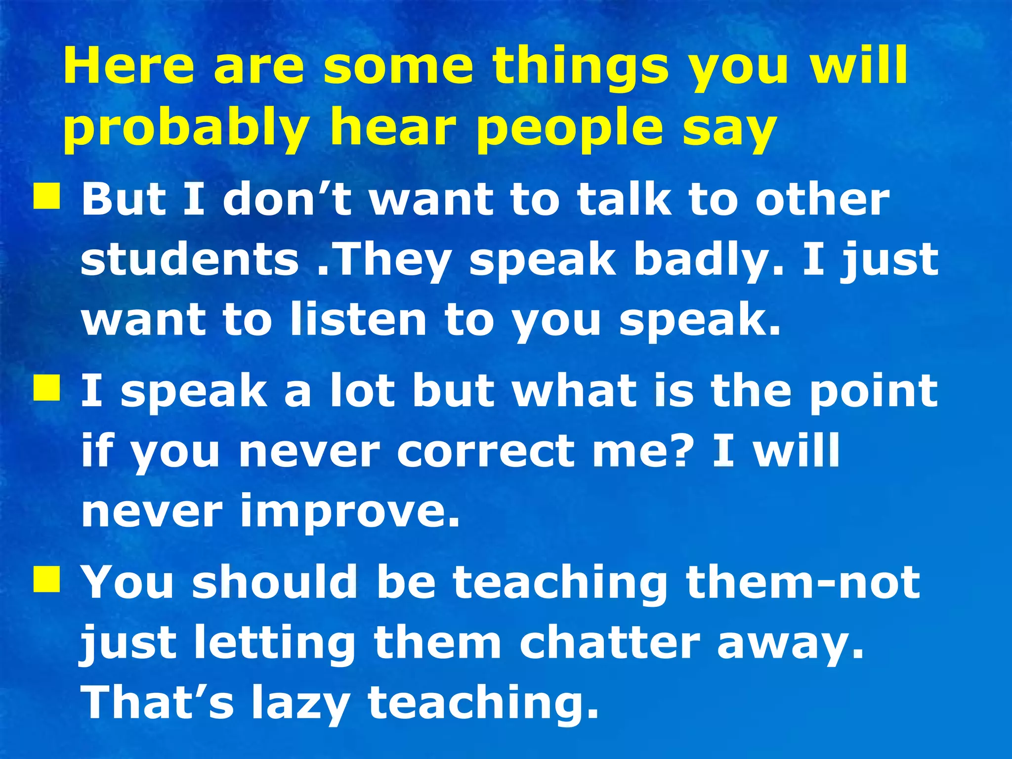 This document discusses teaching methods to improve students' English fluency through communicative activities and role plays. It provides examples of teacher roles and correction techniques that focus on fluency rather than accuracy during activities. These include observing without interrupting and doing follow-up exercises after to address errors. Guidelines are given for organizing role plays, such as preparing students and encouraging improvisation. Some drama games are also described that use movement, imagination and interaction to practice language in context.