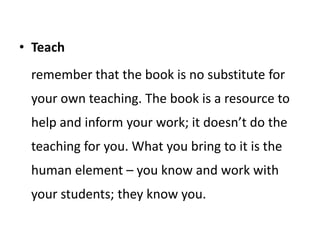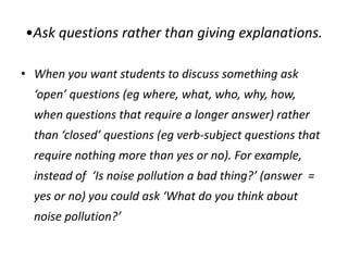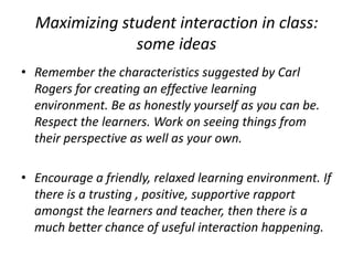 This document discusses effective teaching strategies and provides options for classroom activities and situations. It emphasizes maximizing student interaction through open-ended questions, group work, and encouraging cooperation over competition. The document also discusses balancing language skills and systems in classroom activities and using coursebooks as a resource rather than a strict curriculum.