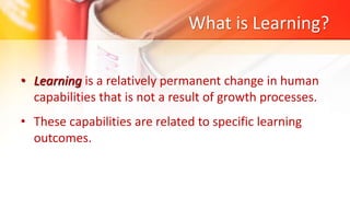 The document explores various learning theories, including behaviorist, cognitive, and constructivist theories, detailing how these frameworks explain the acquisition and organization of knowledge and skills. It discusses key concepts such as classical and operant conditioning, reinforcement theory, and the importance of self-efficacy in learning. Additionally, it highlights adult learning principles that emphasize self-direction, problem-solving, and experiential learning in educational settings.