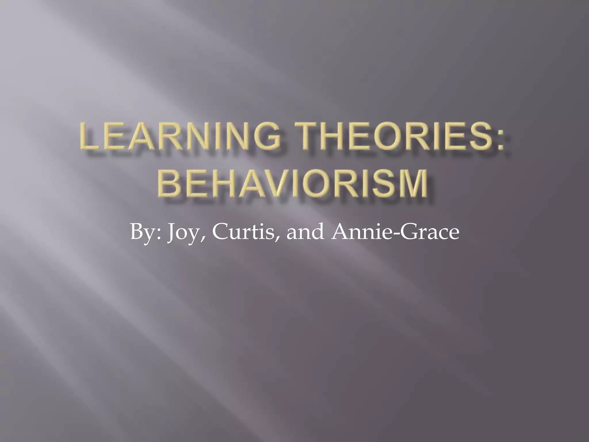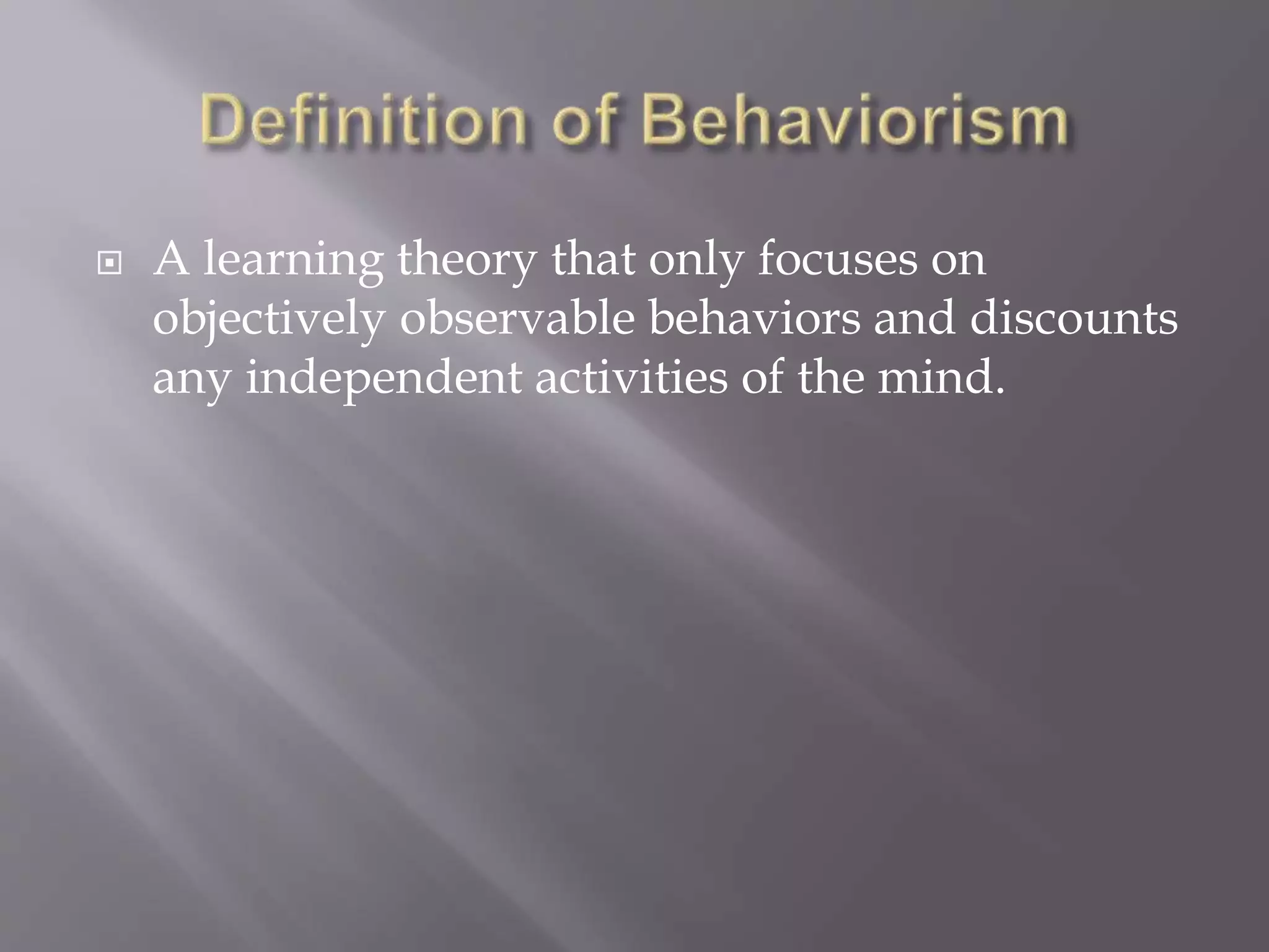 This document discusses behaviorism, a learning theory that focuses on observable behaviors and discounts internal mental processes. It lists influential behaviorists like Pavlov, Skinner, and Thorndike. Key concepts of behaviorism explained are classical conditioning, operant conditioning, and observational modeling. A behaviorist educator would use reinforcement to motivate students, though too strong a focus on extrinsic motivation could undermine intrinsic desires to learn. While reinforcement can be effective, a balanced approach is needed that also supports students' personal motivation to learn for its own sake.