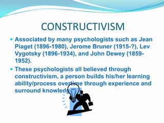 Constructivism is a learning theory developed by psychologists including Piaget, Bruner, Vygotsky, and Dewey. It proposes that people build their understanding of concepts over time through experiences and interactions with their surroundings. By definition, constructivism involves the learner constructing much of what they learn and comprehend. As people age, their way of thinking changes through experience, making topics they previously struggled with easier to understand. In a constructivist classroom, the student explores and the teacher acts as a guide to help students reach their learning goals and become expert learners.