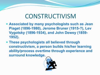 Constructivism is a learning theory developed by psychologists including Piaget, Bruner, Vygotsky, and Dewey. It proposes that people build their understanding of concepts over time through experiences and interactions with their surroundings. By this view, learning involves constructing one's own knowledge instead of just receiving information. Constructivism also holds that as people age and develop, their ways of thinking and learning change through experience. In a classroom, teachers aim to support students in understanding concepts and becoming expert learners, while students explore and discover new information with guidance from teachers.