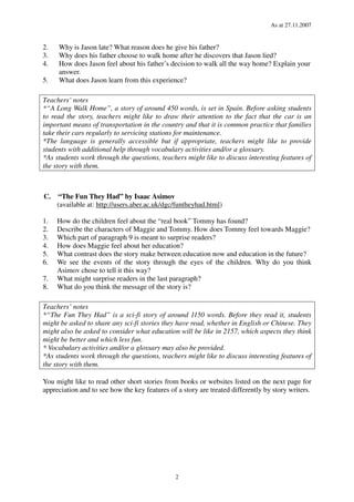 This document provides teaching resources for a module on learning English through short stories. It includes three short stories that students can read and answer questions about to understand key story elements. It also presents activities for adapting a story outline, creating setting, establishing characters, and writing dialogues. The document aims to give teachers examples and guidance for developing lessons and materials to help students work on focuses from the Three-year Senior Secondary English Language Curriculum relating to short stories.