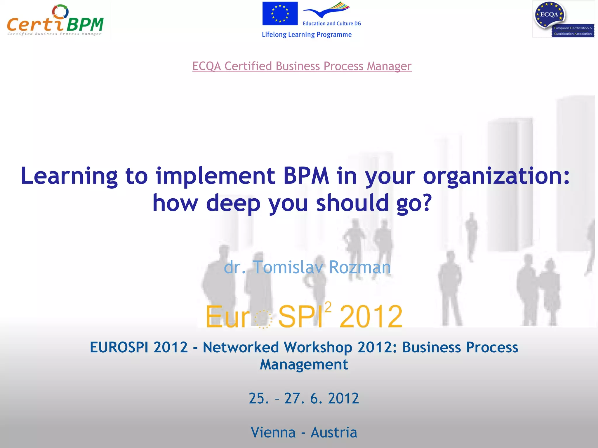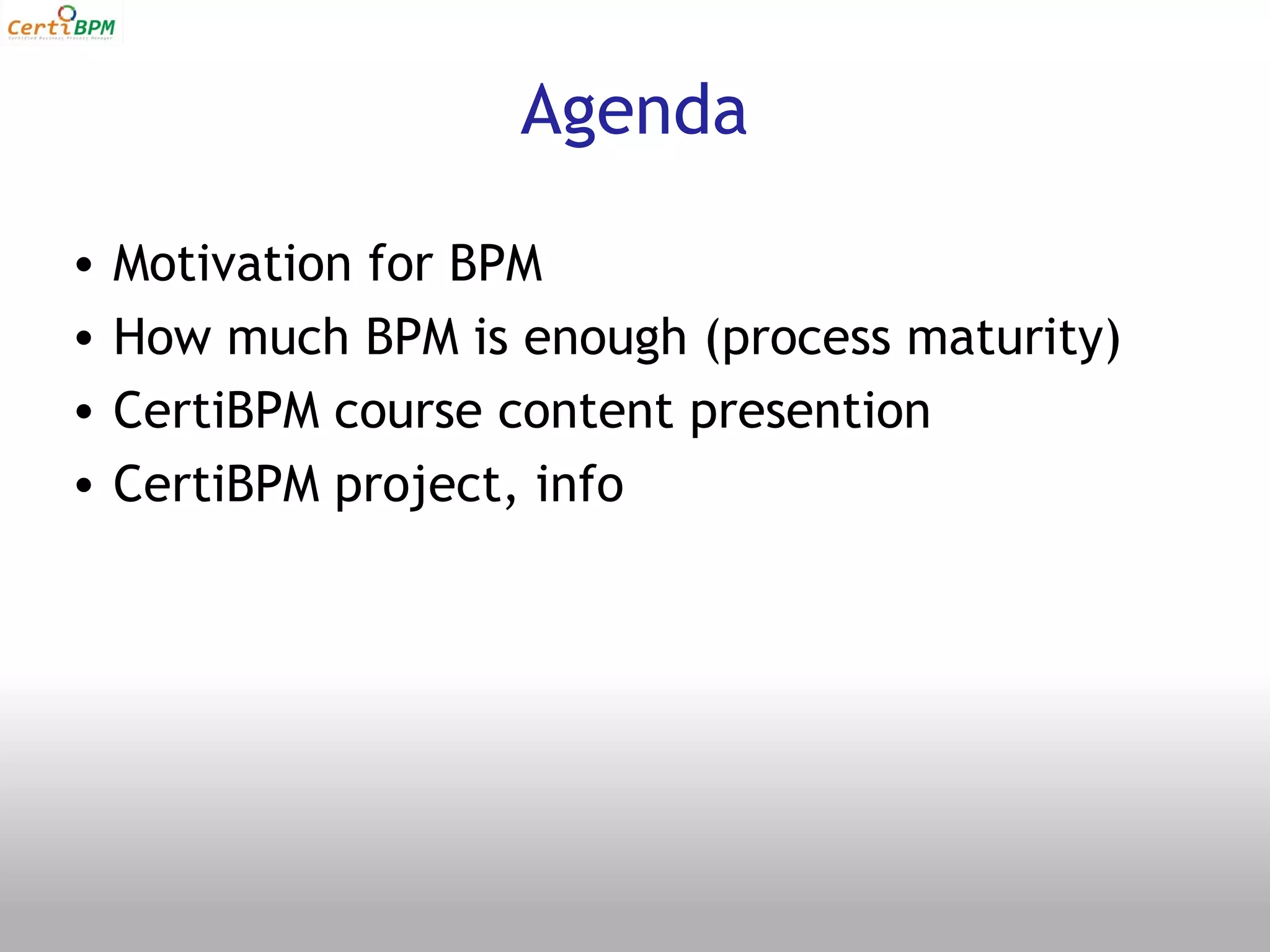 The document provides information about the CertiBPM project, which aims to establish a Certified Business Process Manager job role that is valid across Europe. The project involves adapting an existing BPM course for ECQA certification and university-level education. Partners include universities and private companies from Slovenia, Ireland, and Romania. The goal is to train over 100 students and educators in BPM knowledge and establish a distance learning program to reach more learners across locations. Funding was provided by the European Commission under the Leonardo da Vinci program.