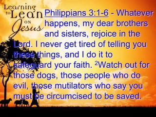 Paul warns Christians against those who say circumcision is necessary for salvation. He emphasizes that true circumcision and worship of God comes through faith in Christ by the power of the Holy Spirit, not human effort to please God through works. Paul contrasts his own past religious credentials and efforts to obey the law with faultless perfection against knowing Christ and relying on what He has done. Living by faith means trusting in God's acceptance of us, rather than trying to earn His favor through good works or spiritual disciplines. Those who focus on pleasing God through their own efforts are not worshiping in spirit and truth, but are exalting themselves, just as the Pharisee did.