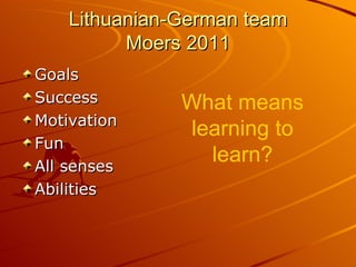 This document discusses learning to learn and how to improve one's ability to learn effectively. It explores what learning to learn means, how people can learn to learn, different learning methods one can use, and why it is important to learn how to learn.