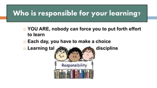 - You are responsible for your own learning through hard work and discipline, though teachers can provide tools and opportunities.