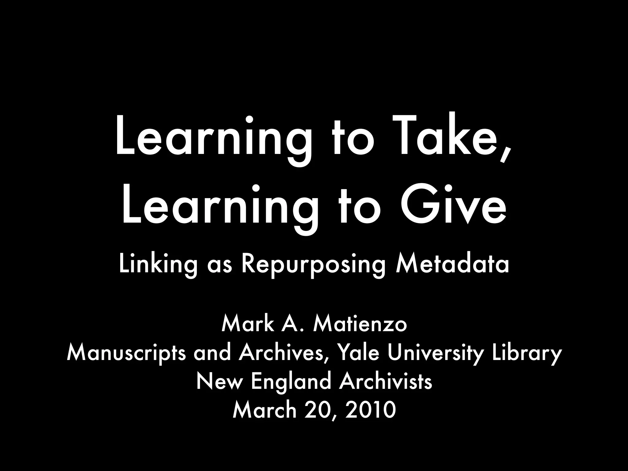 This document discusses how archives can repurpose metadata by linking archival descriptions to related resources on the web. It argues that archives have inherently been linking and relating descriptions through hierarchical descriptions and relationships between records and their creators. The document advocates for using web-friendly URIs, providing information about resources at those URIs, and including links to other related URIs, in order to turn archival metadata into linked open data that can be more freely used and repurposed. This allows archives to focus repurposing outward by enriching and linking their data to other open datasets.