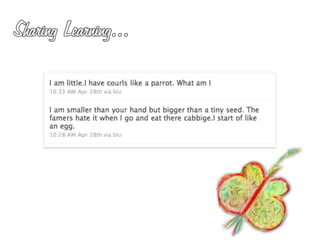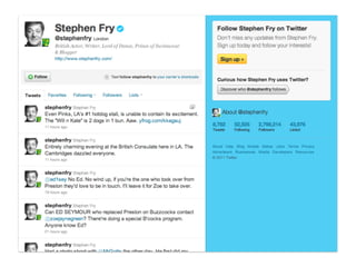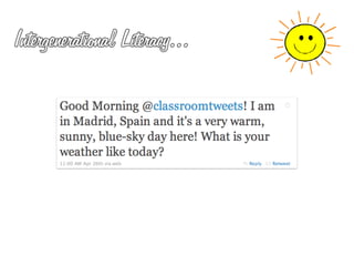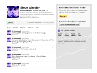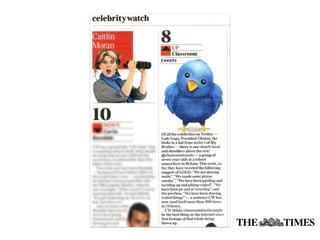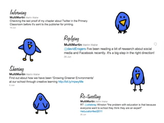 The document profiles Martin Waller, who works as the Creative Learning Coordinator at Holy Trinity Rosehill Primary School, teaching Year 2 and coordinating learning for nursery through Year 6. It also notes that he is a postgraduate student studying New Literacies and does independent educational research with various organizations. The document discusses Waller's work using Twitter in primary classrooms and developing pupil voice through online social networks. It provides definitions and perspectives on social media, networks, and literacy.