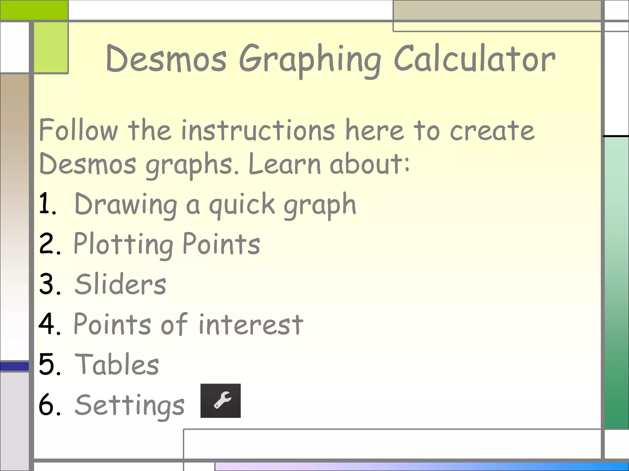 This document provides instructions for using various features of the Desmos graphing calculator, including how to draw quick graphs by typing functions, add sliders to graphs containing variables to explore different values, plot points, view tables of a function's values, and change graph settings like axes. Key features covered are drawing graphs, using sliders, plotting points, viewing tables, and modifying graph settings.