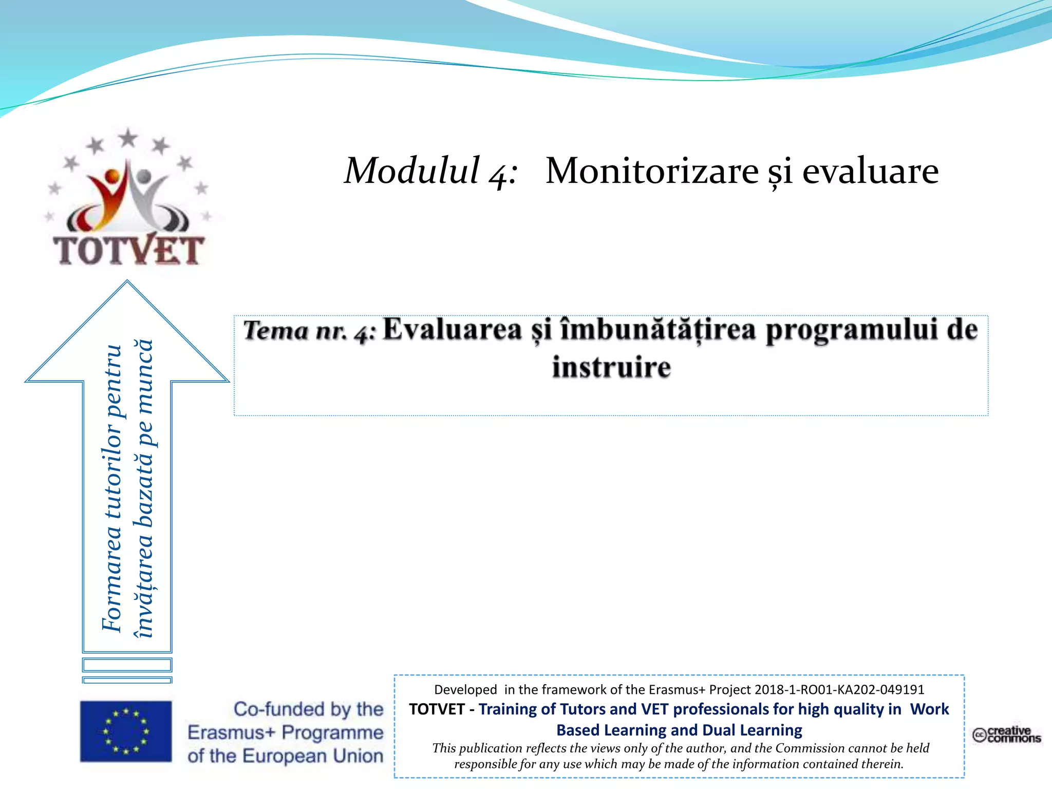 Modulul 4 se concentrează asupra monitorizării și evaluării în formarea tutorilor pentru învățarea bazată pe muncă, subliniind importanța evaluării instruirii, autoevaluării și responsabilităților formatorilor. Se propun pași sistematici pentru crearea unui plan de monitorizare și evaluare, inclusiv identificarea obiectivelor, definirea indicatorilor și stabilirea responsabilităților. De asemenea, se discută despre impactul feedback-ului asupra dezvoltării formabililor și despre adaptarea metodelor de evaluare pentru a se potrivi stilurilor lor de învățare.
