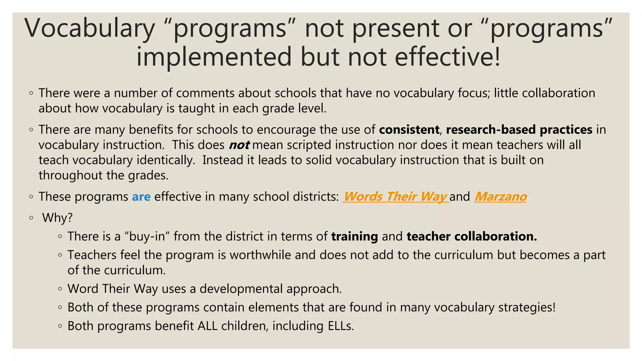 The document discusses research-based vocabulary programs and strategies. It notes that some schools lack focused vocabulary instruction or have ineffective programs. Effective programs like Words Their Way and Marzano see success because of teacher training, collaboration, and inclusion in the curriculum. The document provides recommendations for implementing vocabulary instruction, including using research-based strategies, developing a grade-level plan, benefiting all students including ELLs, encouraging school-wide conversations, and making learning fun. Resources on word walls, technology tools, dictionaries, and games are also included.