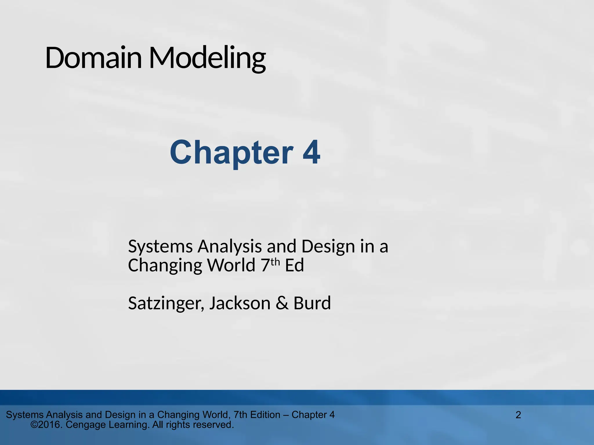 on modeling functional requirements as a part of systems analysis “Things” in the problem domain are identified and modeled, called domain classes or data entities Two techniques for identifying domain classes/data entities are the brainstorming technique and the noun technique Domain classes have attributes and associations Associations are naturally occurring relationships among classes, and associations have minimum and maximum multiplicity 64 Systems Analysis and Design in a Changing World, 7th Edition – Chapter 4 ©2016. Cengage Learning. All rights reserved.