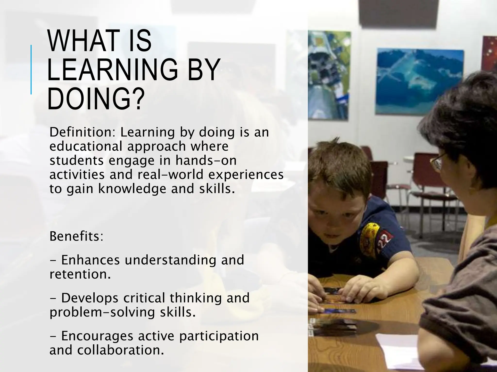 The document outlines the 'learning by doing' educational approach, emphasizing hands-on activities and real-world experiences to enhance student understanding, critical thinking, and engagement. It provides examples, including role-playing, storytelling, project-based learning, and integrating technology, along with steps for implementation and related activities for different age groups. The text also highlights successful case studies and offers tips for effective implementation in classrooms.