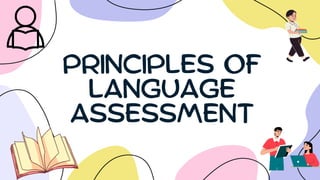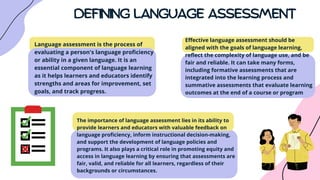 This document discusses principles of effective language assessment. It defines language assessment as evaluating language proficiency or ability. Effective assessment should be aligned with learning goals, reflect real language use, and be fair and reliable. There are different types of language assessment, including formative to provide feedback, summative for evaluation, and diagnostic for identifying strengths and weaknesses. Key considerations for effective assessment include validity, reliability, authenticity, transparency, and fairness. Assessment is important for learners and educators to evaluate proficiency and inform instruction.