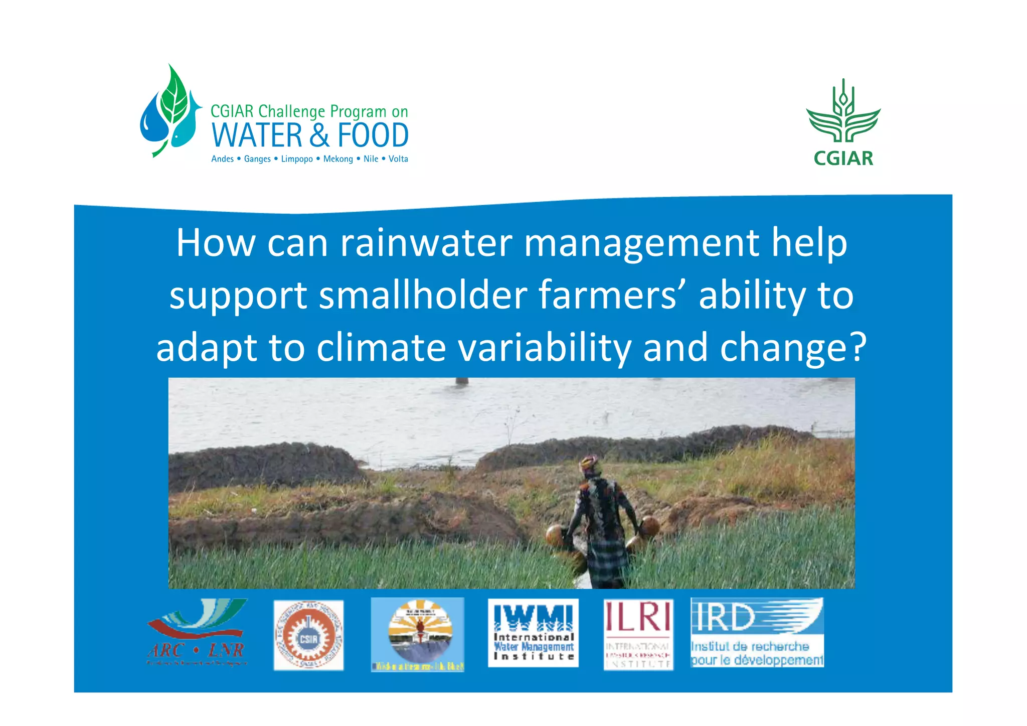 This document discusses how rainwater management can help smallholder farmers adapt to climate variability and change. It notes that rainfed farming is at risk from increasing climate variability. Several rainwater management options are presented, including capturing, storing, and managing water at the landscape level. Case studies of successful rainwater management innovations in Africa are provided, including Zai pits, groundwater utilization, and landscape water management. The document advocates for investing in rainwater management and strengthening local institutions to support smallholder farmers' resilience.