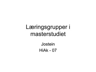 Struktur på møtenei læringsgruppa Innledende runde om hendelser siden sist. (kort) Planlagte faglige innspill etter forespørsmål Veiledning av den enkeltes forskingsarbeid (30 minutt til hver, 2 ½ time) Faglig utdyping som resultat av veiledning Om gruppe og læringsprosessen i læringsgruppa Evaluering av prosessen i samsvar med normer for gruppa, og til god veiledning (30 min)