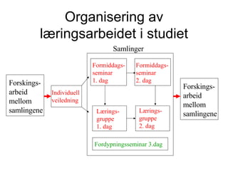 Organisering av læringsarbeideti studiet Formiddags- seminar 1. dag Formiddags- seminar 2. dag Lærings- gruppe 1. dag Lærings- gruppe 2. dag Individuell veiledning Samlinger Fordypningsseminar 3.dag Forskings- arbeid mellom samlingene Forskings- arbeid mellom samlingene