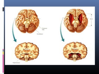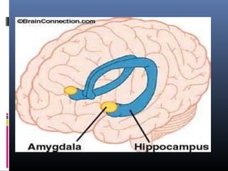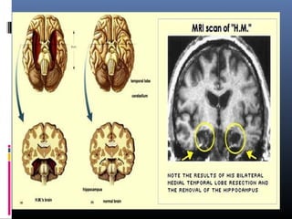 The document discusses learning and memory. It explains that learning involves how experience changes the brain, while memory involves how these changes are stored and retrieved. It describes the different types of memory (sensory, short-term, long-term) and where memories are stored in the brain. The case of patient H.M., who had medial temporal lobe removal, demonstrated the role of these areas in forming new memories and provided evidence for separate short-term and long-term memory systems. Concussions can cause retrograde and anterograde amnesia, providing evidence that memories are consolidated over time.